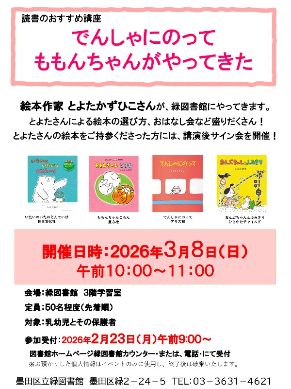 【緑図書館】読書のおすすめ講座「でんしゃにのって ももんちゃんがやってきた」を開催します