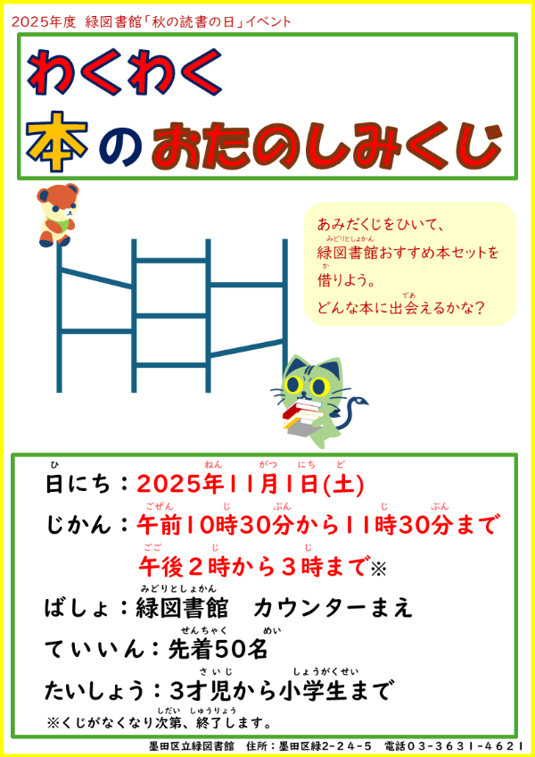 【緑図書館】秋の子ども読書の日イベント「わくわく 本のおたのしみくじ」を開催します
