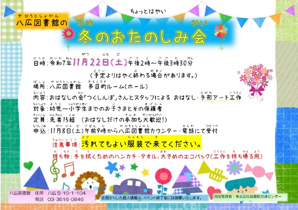 【八広図書館】冬のおたのしみ会を開催します。