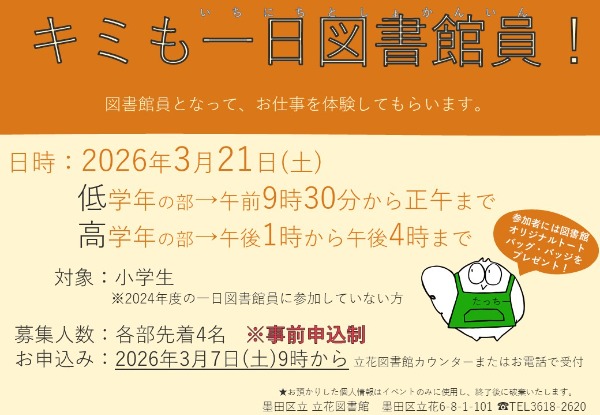 3月7日(土)午前9時より立花図書館カウンターまたはお電話(03-3618-2620)で受付します。