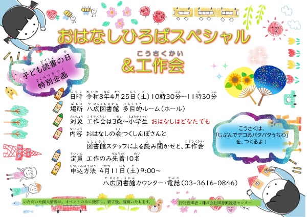 【八広図書館】「子ども読書の日 おはなしひろばスペシャル&工作会」を開催します